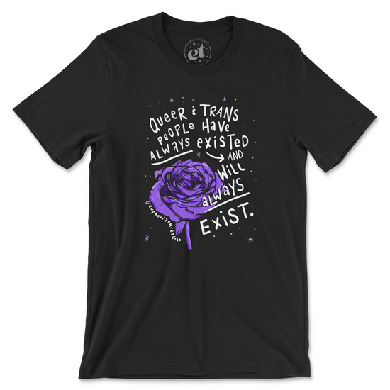 The Euphoria Threads Always Existed tee shows the world that queer and trans people have and will *always* exist. Featuring a hand-drawn purple rose, a night sky, and bold typography, this design pushes back against the systems that try to define us, silence us, or rewrite our history. It’s a reminder we have always been here, and are not going anywhere.