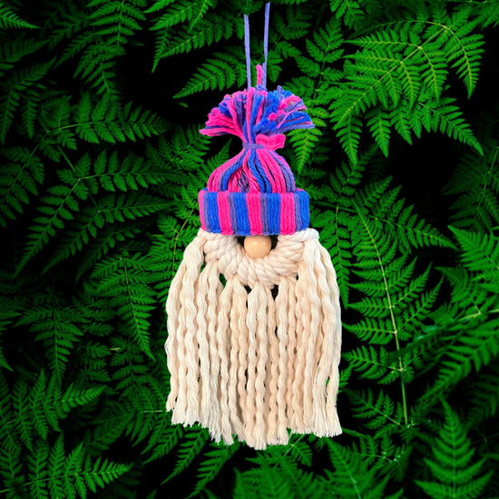 Gnomes, gonks, hobgoblins... These wee, mischievous creatures hail from Scandinavia and have protected humans from evil for hundreds of years. Get one (or several!) for good luck and protection. This macrame gnome is made by our queer artist, Misty, and is the perfect addition to your home decor to show bisexual pride and love for the community.