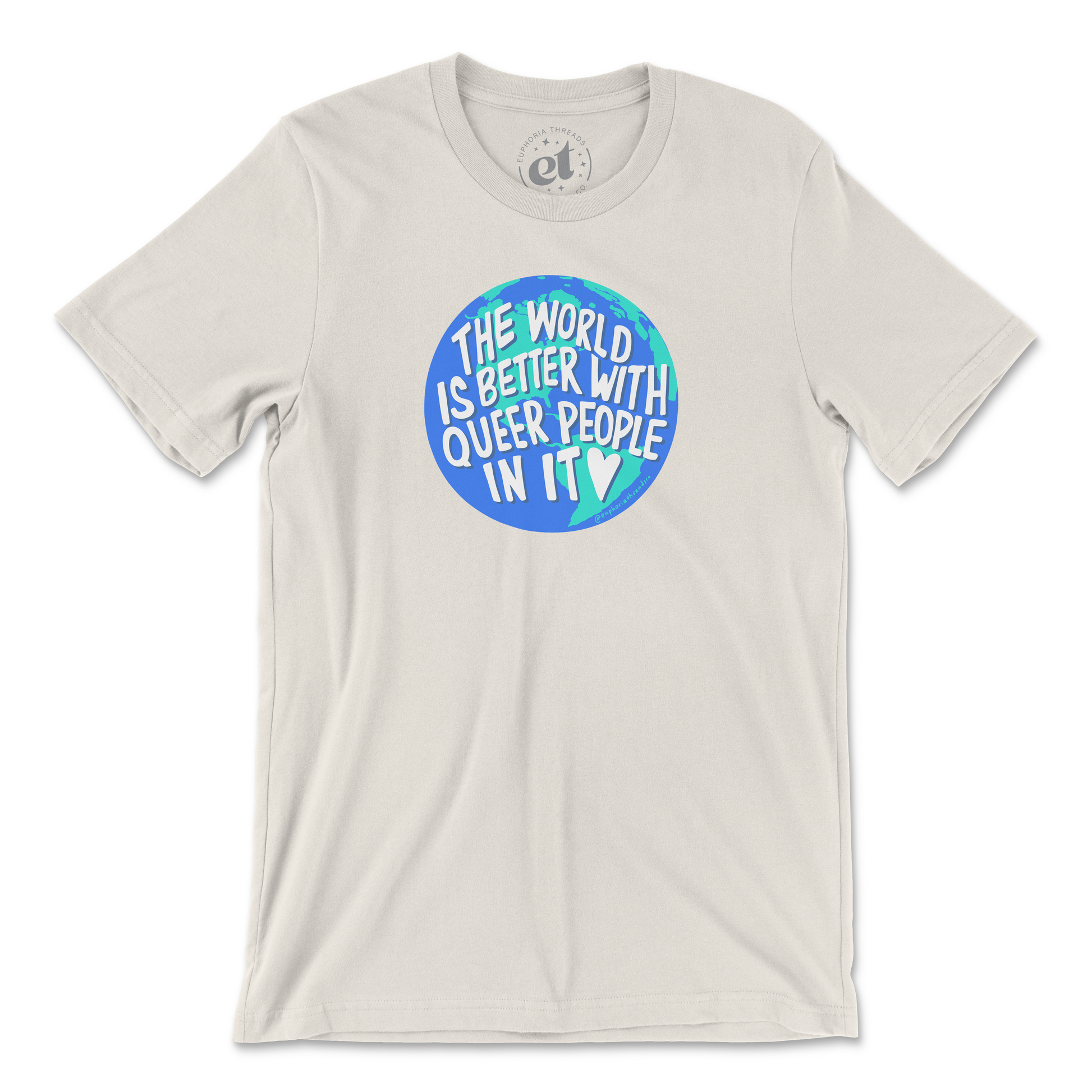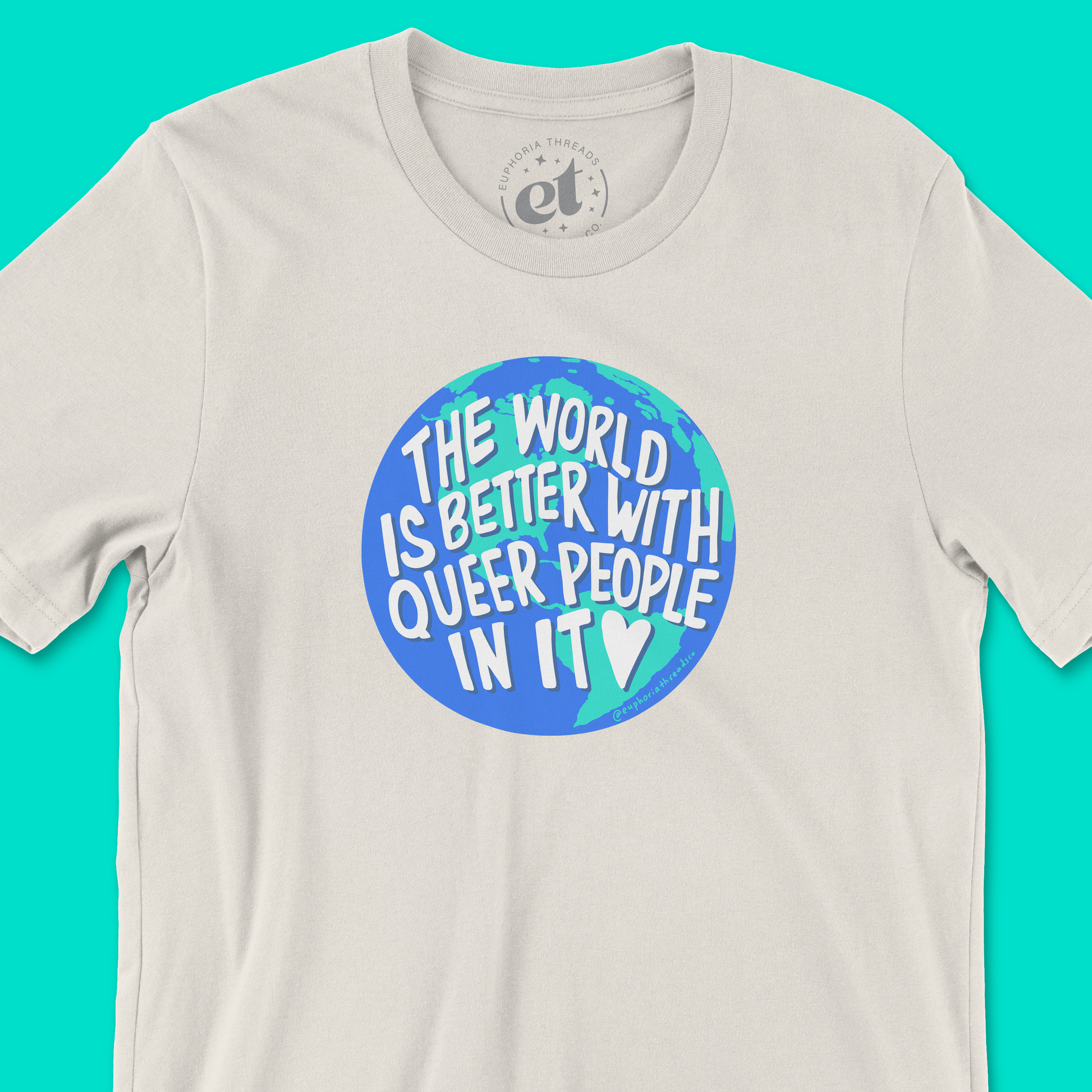 The Euphoria Threads 'The World Is Better With Queer People In It' tee serves as an affirmation that every queer person enriches our communities and makes the world a better place. By wearing it, you join a collective movement that champions acceptance and love for all. Stand in solidarity with queer people around the world and advocate for a future where everyone can thrive as their authentic selves. Together, let’s spread love and positivity throughout the queer community!