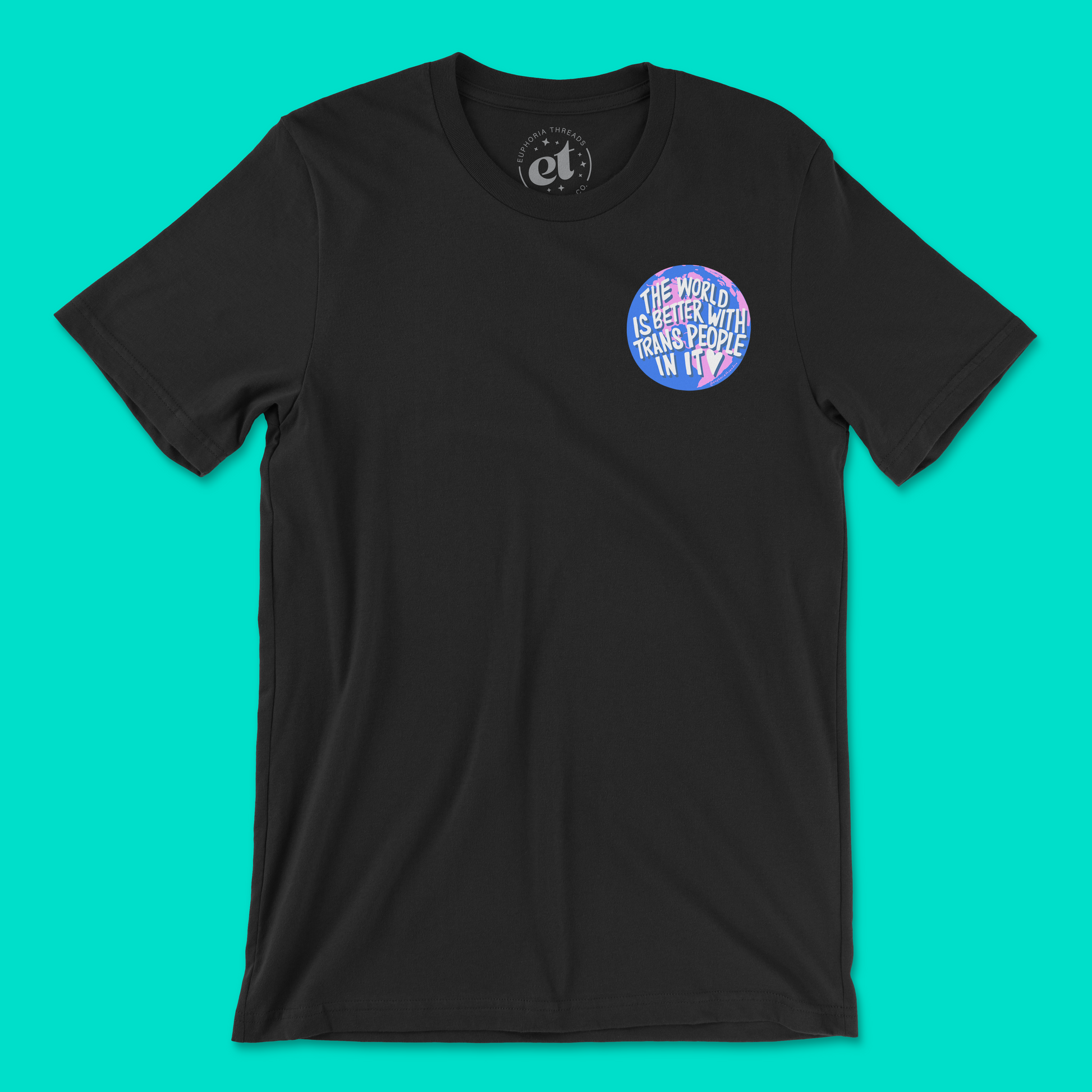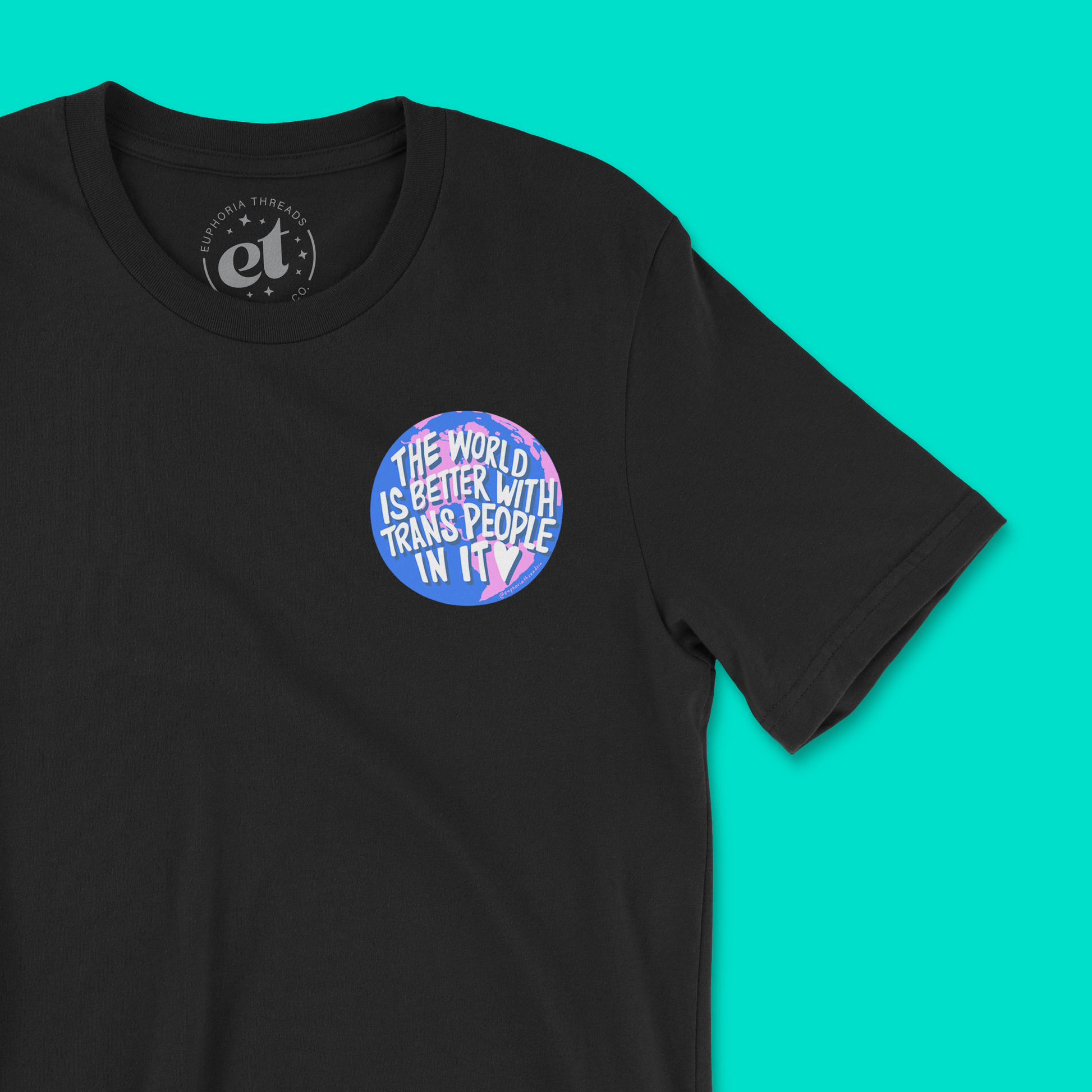 By wearing the Euphoria Threads 'The World Is Better With Trans People In It' tee, you become part of a collective movement that champions acceptance, love, equal rights, and respect for trans people across the world. Together, let's raise awareness, combat discrimination, and promote understanding. Join in spreading love and positivity throughout the trans community, because a world that uplifts trans lives is a world that is better for everyone!
