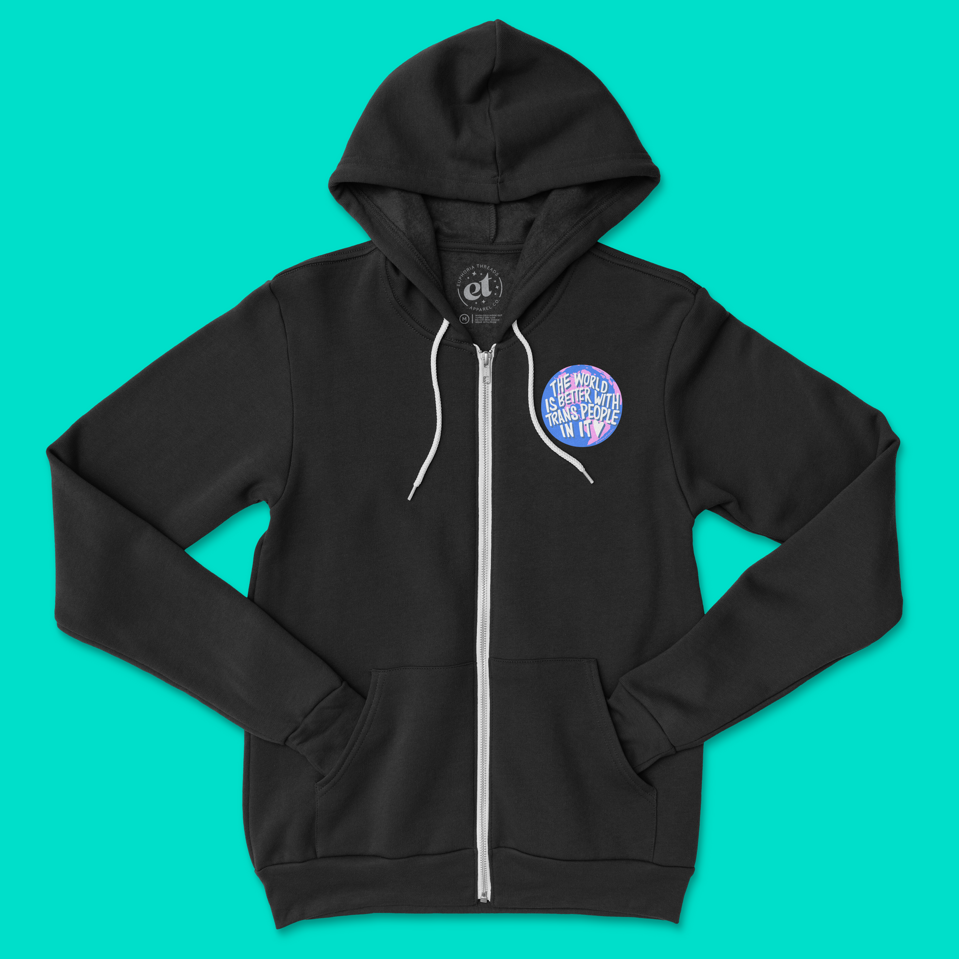 By wearing the Euphoria Threads 'The World Is Better With Trans People In It' unisex zip hoodie, you become part of a collective movement that champions acceptance, love, equal rights, and respect for trans people across the world. Together, let's raise awareness, combat discrimination, and promote understanding. Join in spreading love and positivity throughout the trans community, because a world that uplifts trans lives is a world that is better for everyone!