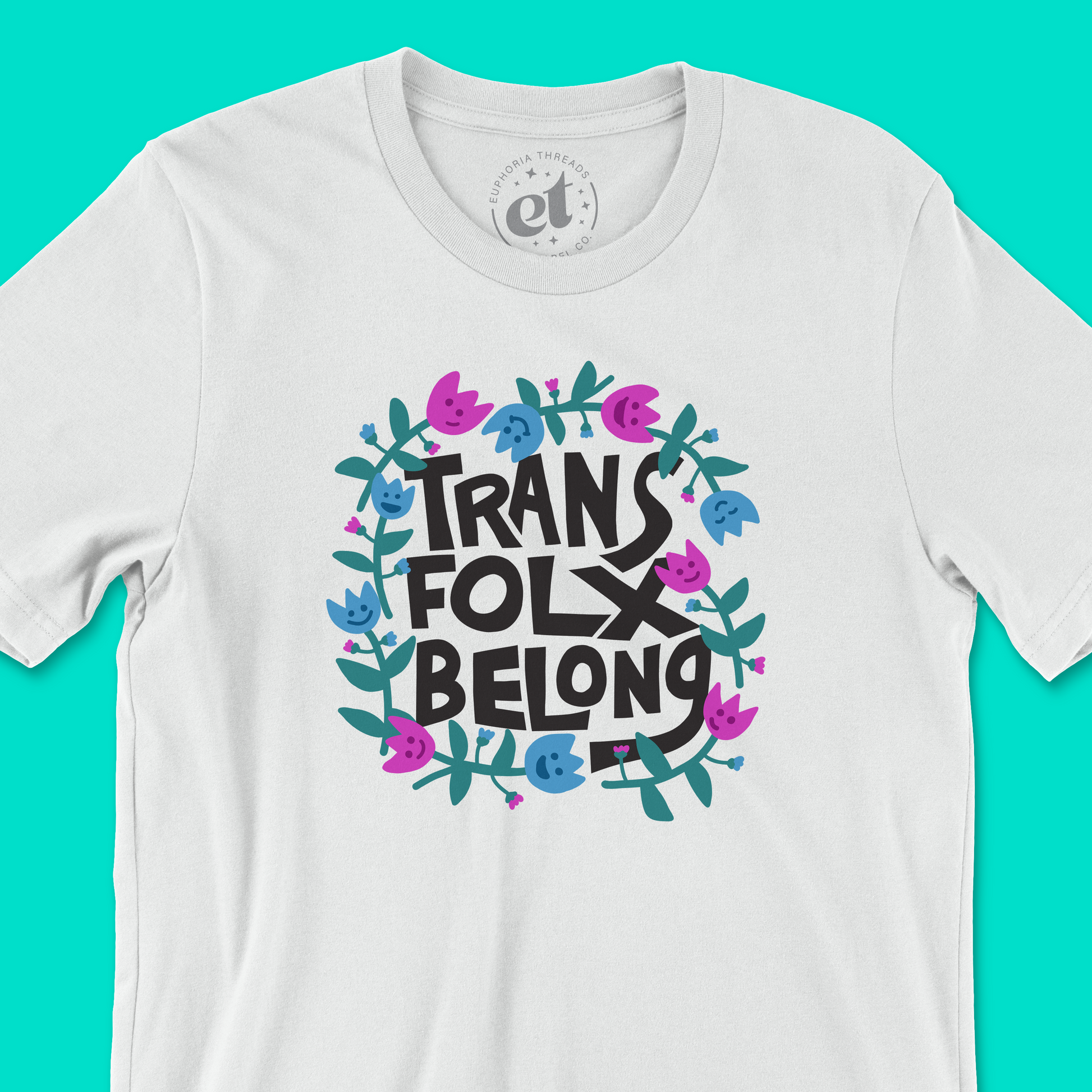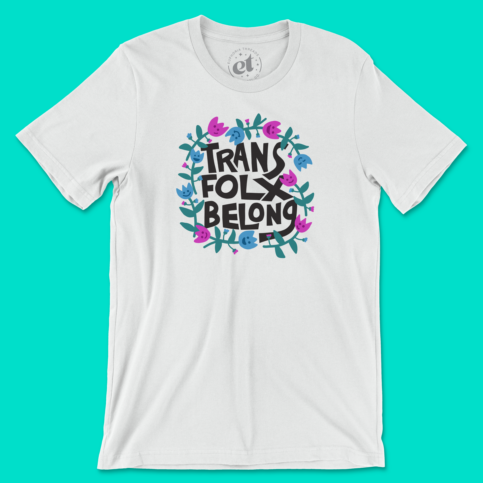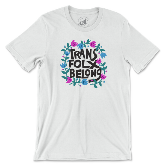 Show your support for the trans community with our Euphoria Threads "Trans Folx Belong" unisex tee. The bold message is beautifully accented by playful blue and pink smiley flowers in the colors of the trans flag. This eye-catching design not only expresses your unwavering love for the trans community but also ensures you stay comfy and stylish.
